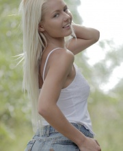 As the gentle breeze blows her nipples get harder and she feels like revealing more. By spreading those legs the blonde babe shows she's not wearing any pants and reveals a tight little pussy that will make you crave for more of her.